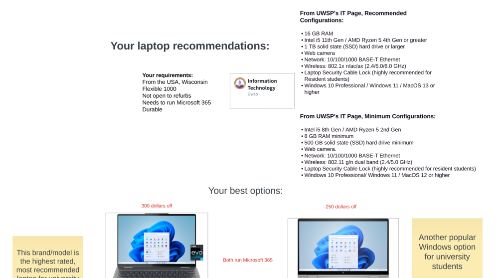 Here are your laptop recommendations. It specifically takes into account your budget, University of Wisconsin Steven Point's requirements, what other students at your college ended up buying and liking, and the specs you need to ensure this is a long lasting purchase.